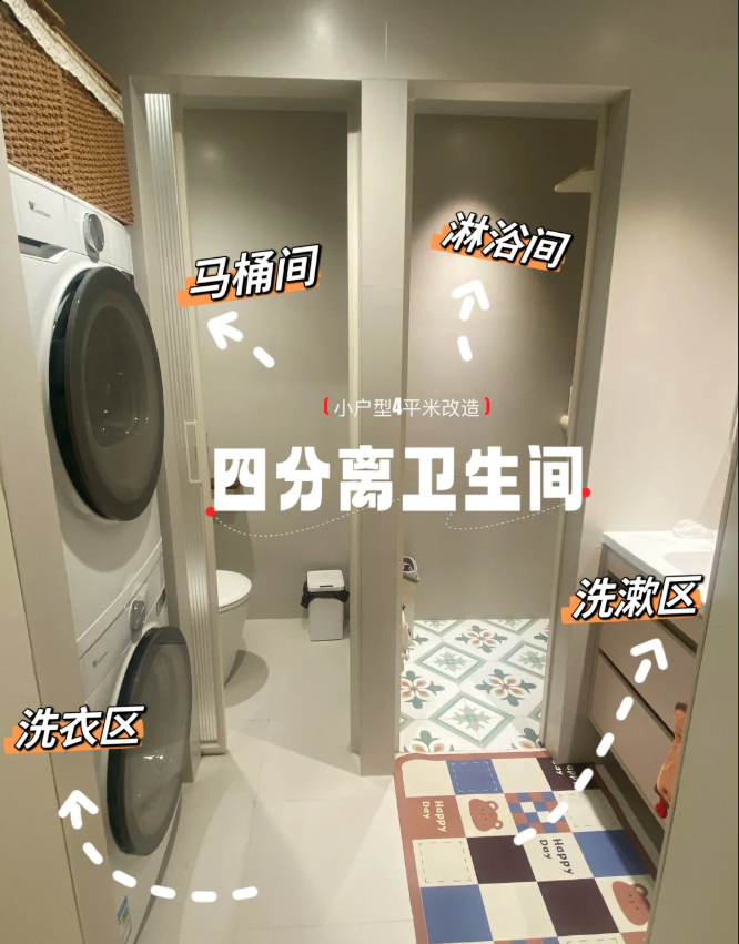 在三分离基础上加入「洗衣烘干区」,实现「洗澡 - 洗衣 - 烘干」一条龙: