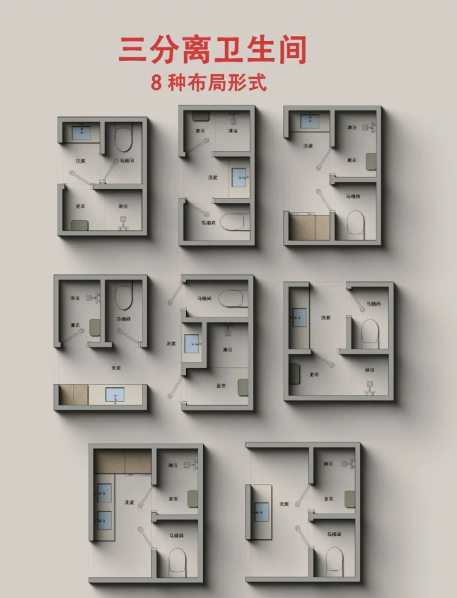小户型:优先保证「马桶间独立」,哪怕淋浴区和洗漱台共用一块空间,也能解决「上厕所被打扰」的核心痛点;用推拉门、折叠门代替平开门,节省开门空间。